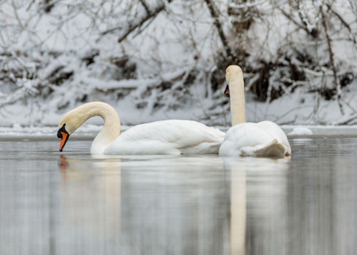 W czasie silnych mrozów łabędzie oszczędzają energię, dlatego często siedzą nieruchomo na lodzie, chowając nogi pod siebie. To naturalne zachowanie, które bywa mylnie interpretowane jako „przymarznięcie”. W rzeczywistości łabędzie przymarzają tylko w skrajnych sytuacjach – gdy mróz pojawia się nagle, szczególnie po okresie odwilży, a ptak jest osłabiony, chory lub bardzo młody. Zwykle powodem problemu jest zaniedbane upierzenie, bo zdrowy łabędź regularnie dba o swoje pióra, co chroni go przed zimnem.
